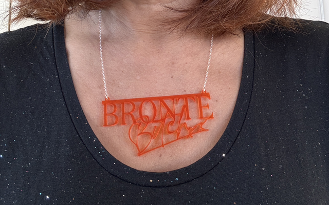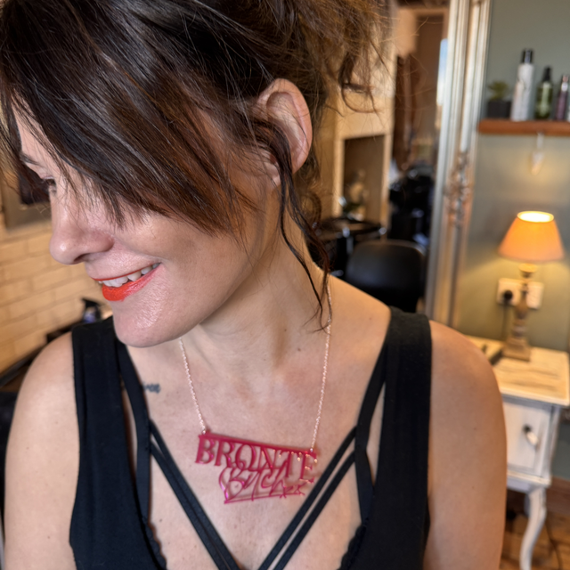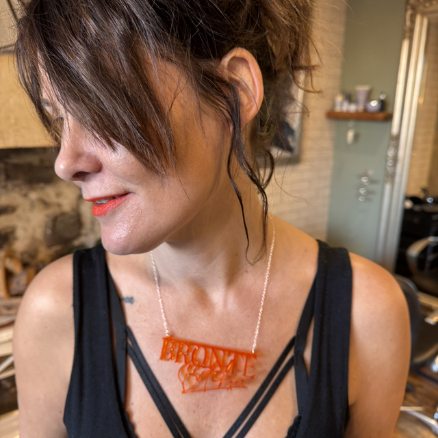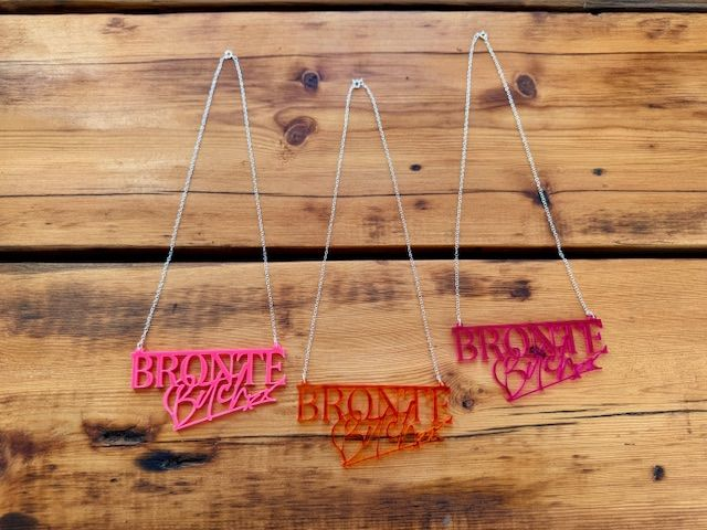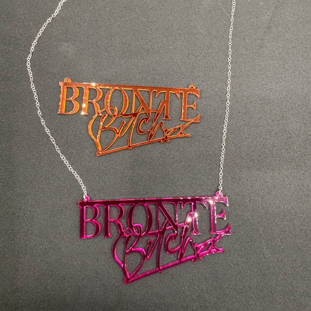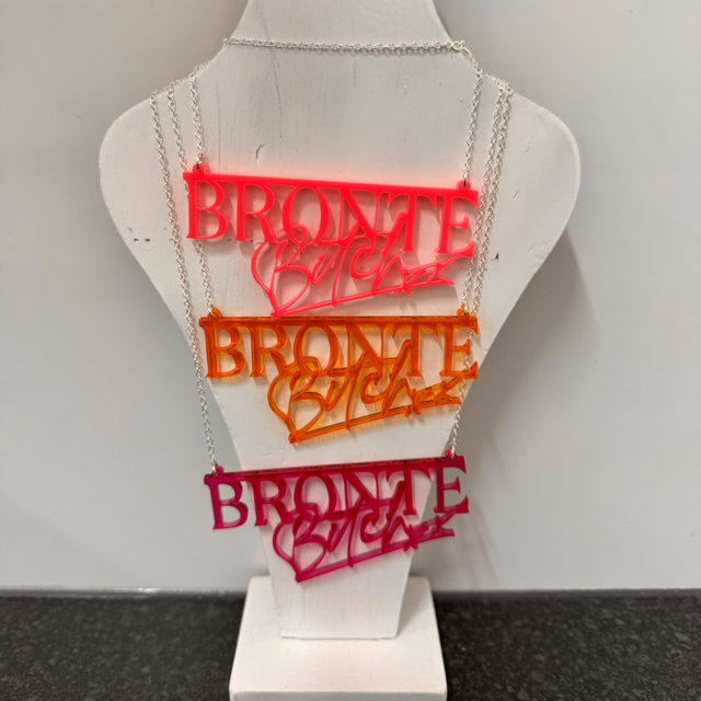Brontë Bitch branded 'transparent amber or transparent pink' acrylic necklace also available in an exclusive one- off Hi-vis Pink necklace (see pics).